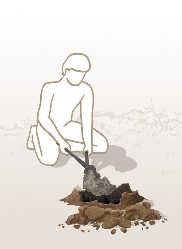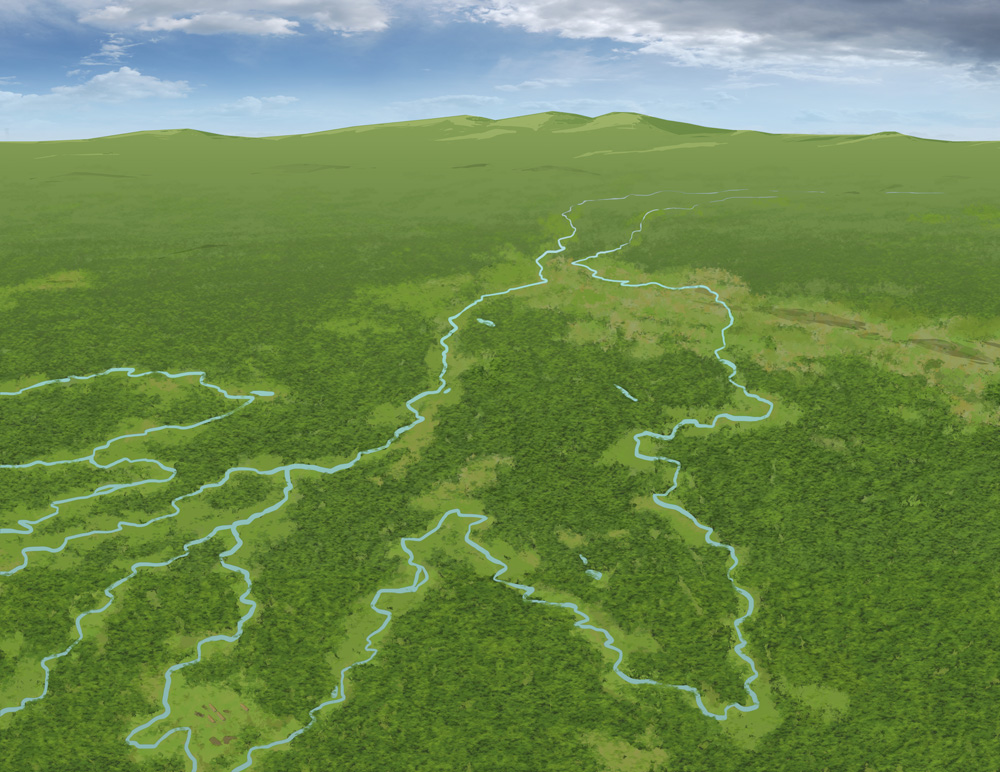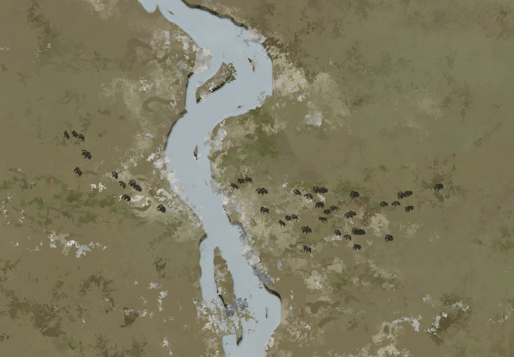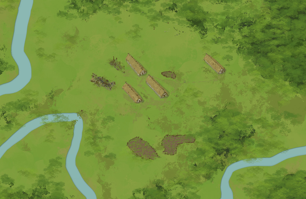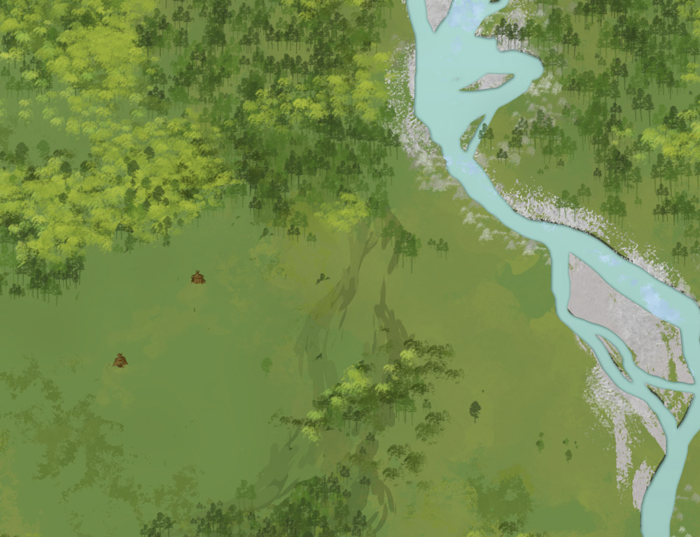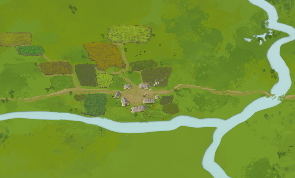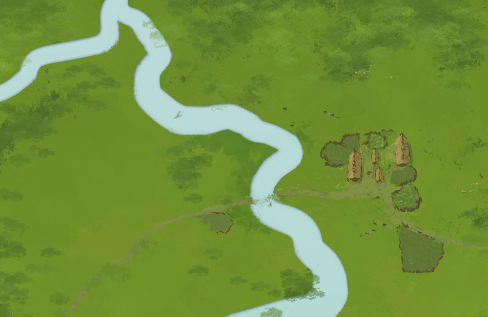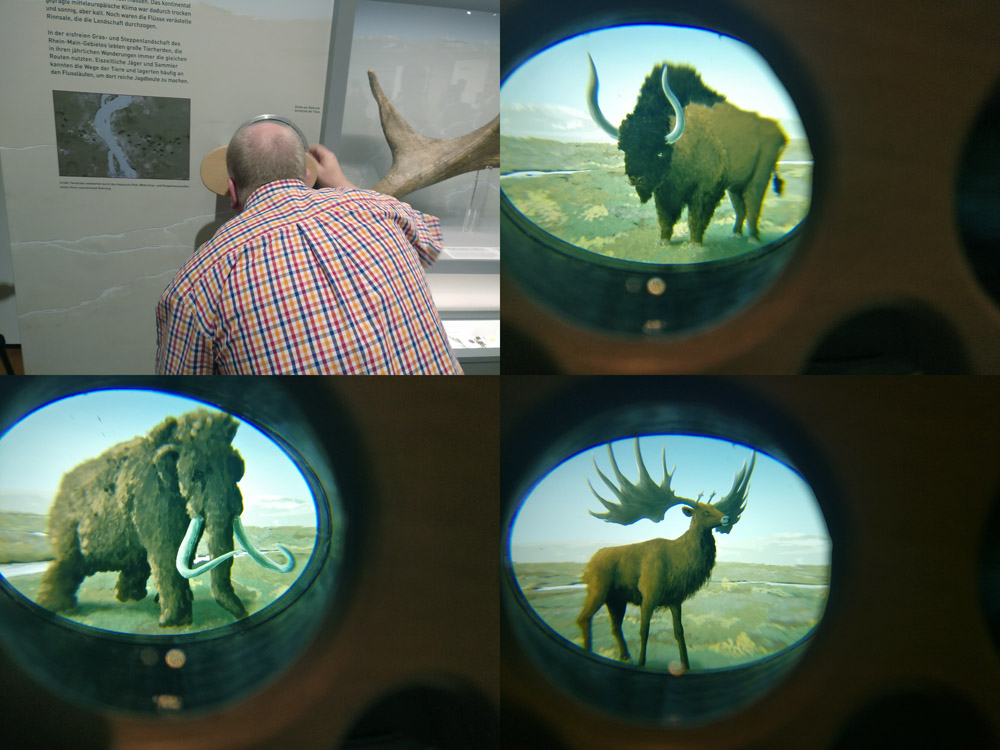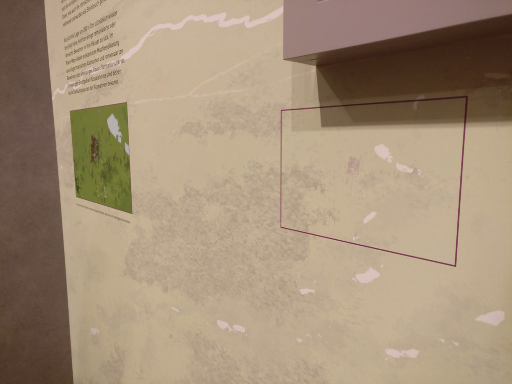Im Rahmen der Ausstellung „Raumzeit. Archäologische Spuren in der Mainspitze“ illustrierte ich für das Ausstellungsbüro schwarz-düser · düser auf sieben großflächigen Wandbildern (je ca. 4 × 2 m) die Entwicklung der Region um Rüsselsheim von der Eiszeit bis ins Frühmittelalter: Landschaftsveränderungen, sich wandelnde Flussläufe, frühe Siedlungen, römische Villen, Hügelgräber oder veränderte Vegetation.