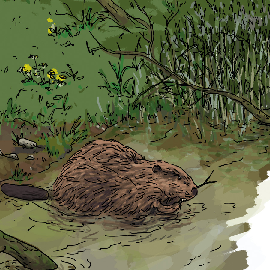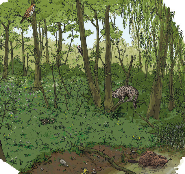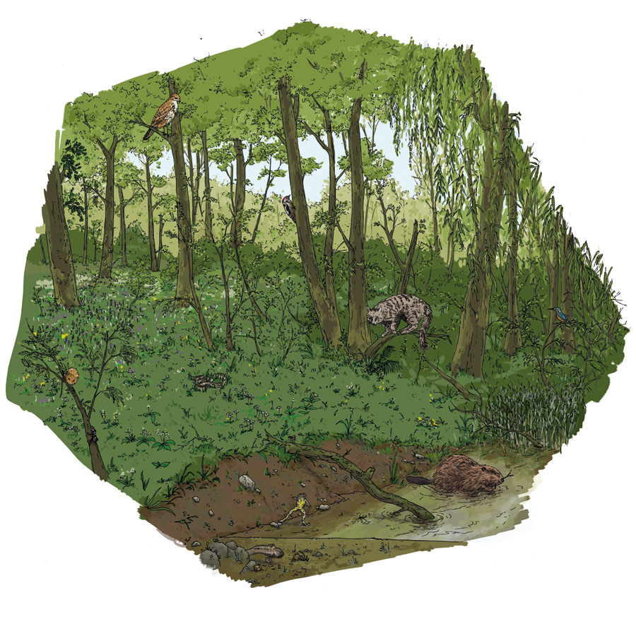 Im Kulturhaus “Altes Forsthaus Hördt” entstand eine Ausstellung über das Naturschutzgebiet “Hördter Rheinaue“. In dieser Rheinauenlandschaft sind viele geschützte und bedrohte Tierarten und Pflanzen zu finden. Einige Bewohner dieser Auwälder sollten in einem großen Wimmelbild dargestellt werden. Neben Pflanzen wie Eschen, Ulmen, Bergahorn oder Schwarzpappeln musste ich Tiere wie Biber, Haselmaus, Wasserläufer oder Hirschkäfer in dieser Illustration verstecken” Insgesamt finden sich 13 verschiedene Tiere wieder, die alle mit Liebe zum Detail gezeichnet und digital koloriert wurden.